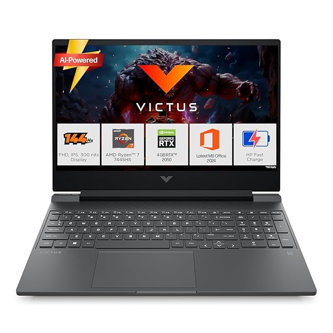 HP Victus, AMD Ryzen 7 7445HS, 4GB RTX 2050, 16GB DDR5(Upgradable) 512GB SSD, FHD, 144Hz, 300 nits, IPS, 15.6”/39.6cm, Win11, M365* Office24, Mica Silver, 2.29kg, fb3123AX, Backlit, Gaming Laptop